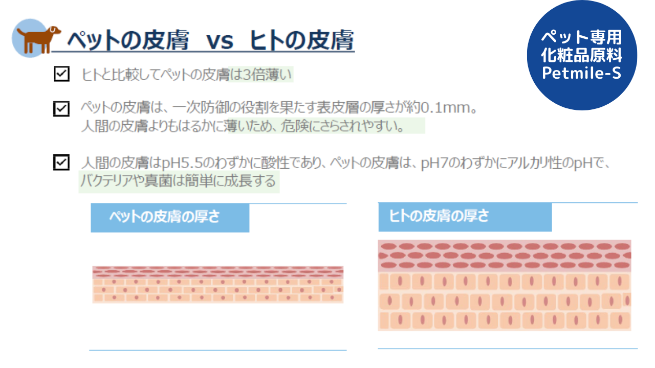 開発にあたって着目したのが、ヒトとペットの肌の違いです。なんと、ペットの肌は人よりもずっと薄く、様々な脅威にさらされやすいという衝撃の事実が、開発の過程で明らかになりました。特に、イヌでは、表皮細胞の層数やpHも異なっており、ヒトの肌とは何もかもが違います。