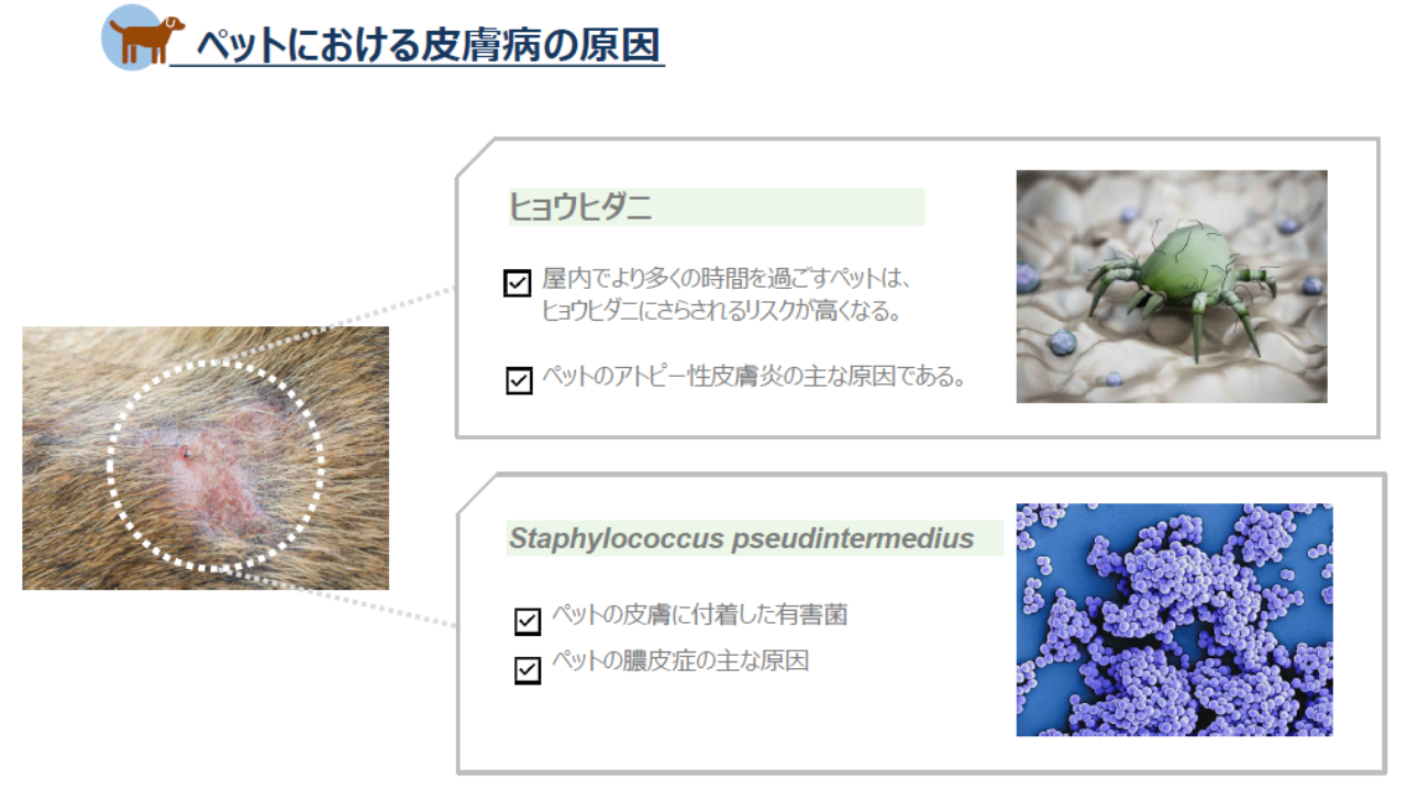 薄いペットの肌において、トラブルとなりえるのが、ヒョウヒダニと菌(Staphylococcus pseudintermedius)。本原料はこれらの問題に立ち向かうために、開発がすすめられました。
