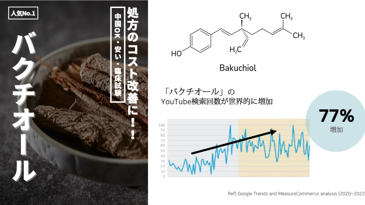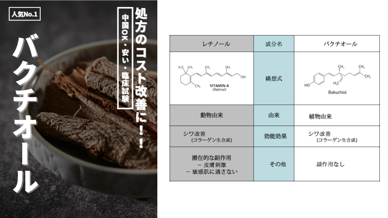 読者のみなさん(化粧品業界)は、『バクチオール』という成分のことをよくご存じだと思います。バクチオールは、自然由来の成分で、ビタミンAの一種であるレチノールと似た効果が期待でき、レチノールよりも刺激が少ないという点からその知名度が一気にあがりました。敏感肌をターゲットにした、日常のスキンケアに取り入れやすい成分として展開されています。