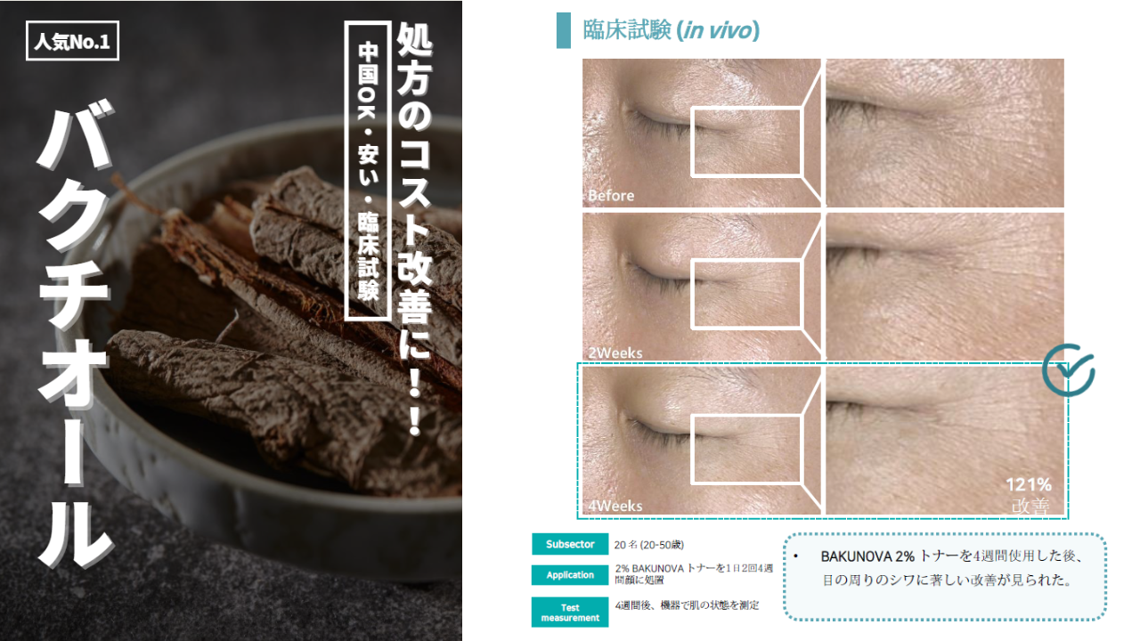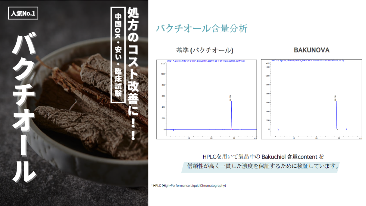 本原料BAKUNOVA(バクノバ)は、NMPAに登録した全成分比率情報も提供可能であり、中国案件にも活用できるバクチオール原料です。また、既存バクチオール原料とは、粗原料が異なるため、コスト面・供給面でメリットのある原料製品となっております。