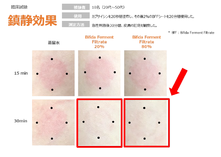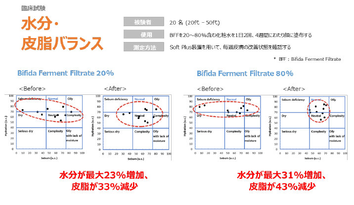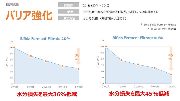 また、Bifida Ferment Filtrate(Ⅰ)は、アミノ酸や乳酸、多糖類など皮膚にとって有用な成分を含むビフィズス菌の培養液であり、水を置き換えて化粧品処方に配合することで、最終製品により高い有効性のイメージや、付加価値を与えることが可能です。