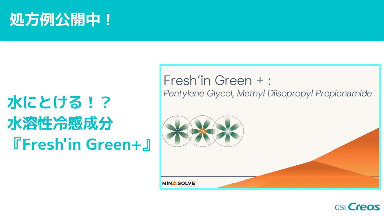 Fresh'in Green+という原料をご存じないかたは、ぜひ以下のリンクをご覧ください。 メントールの強すぎる冷感が苦手な方、メントールの溶解性に苦慮しておれれるかた、エタノールフリーの冷感処方にチャレンジしている方には特にオススメです。