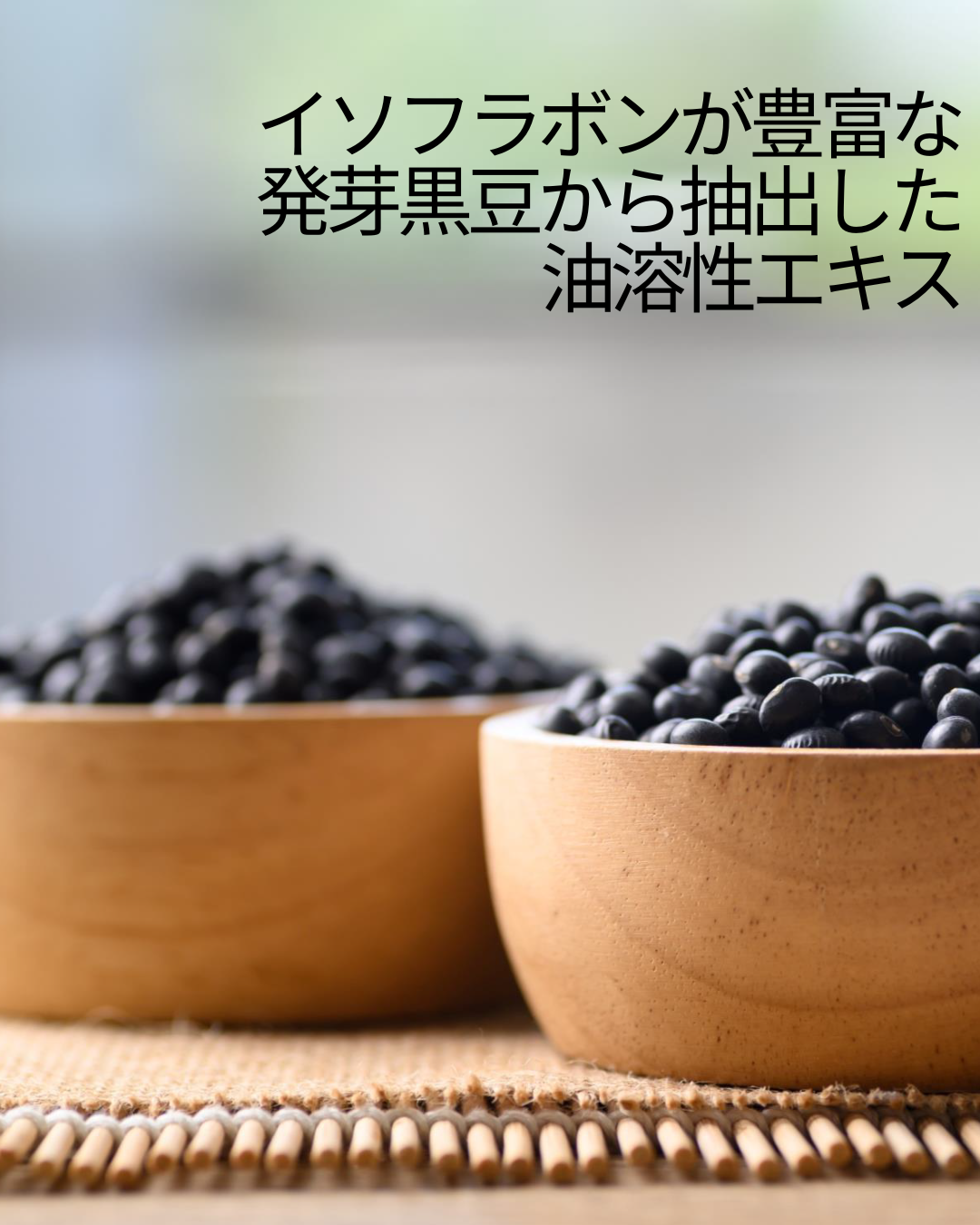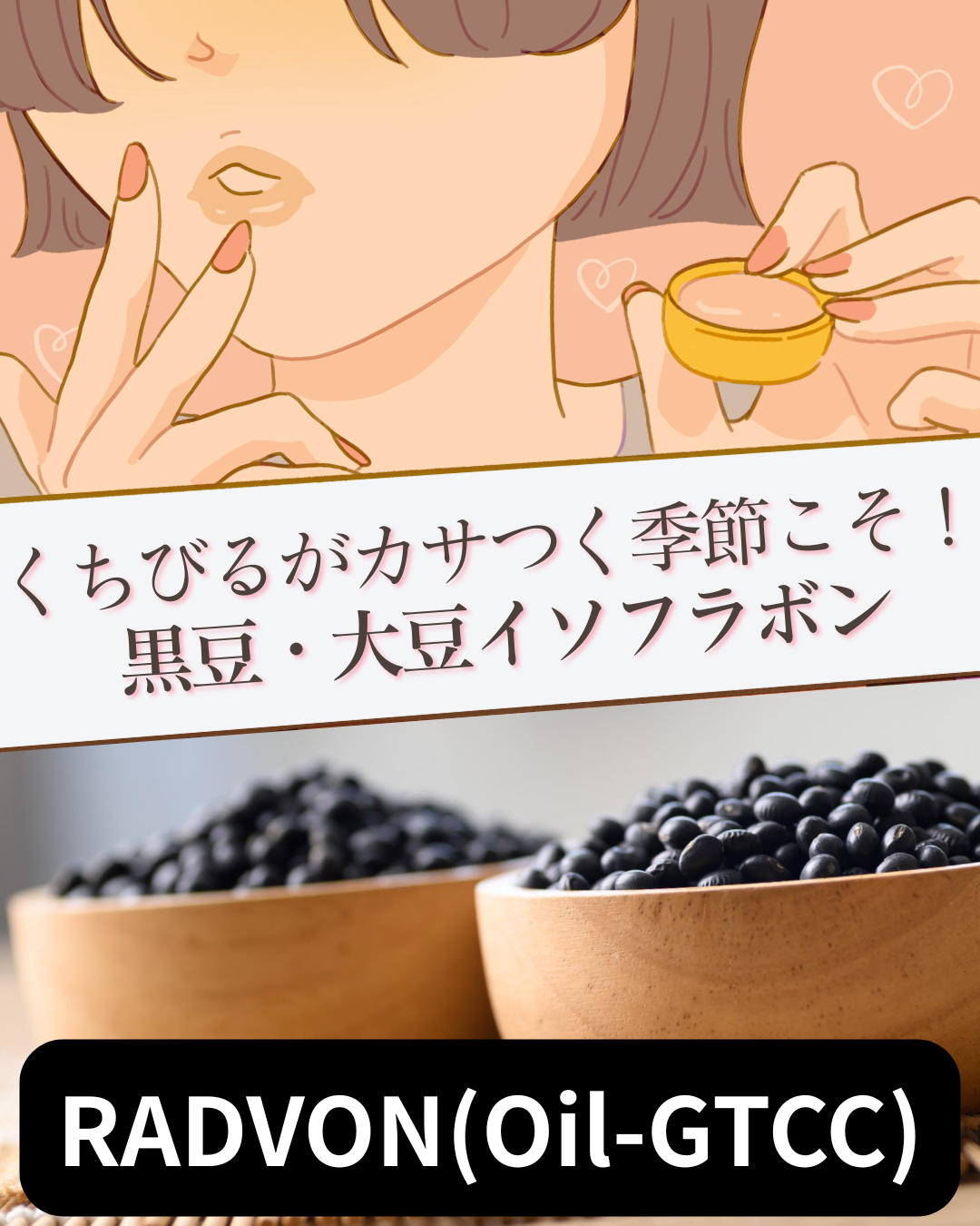 本日は、カサつく唇を救うことができる化粧品原料のご紹介です。それが、RADVON (Oil-GTCC)。イソフラボンリッチな 発芽黒豆からオイル抽出したエキス原料です。