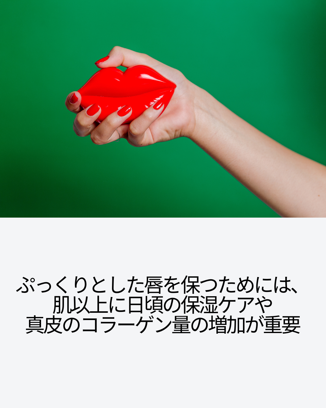 唇の表皮には皮脂腺・汗腺がほぼないため皮膜ができず、水分保持機能も低いです。そして角層は非常に薄くバリア機能も脆弱なため、外的ストレスを受けやすいという特徴をもちます。ターンオーバーサイクルが4~7日と早く、ぷっくりとした唇を保つためには、肌以上に日頃の保湿ケアや真皮のコラーゲン量の増加が重要だといわれています。