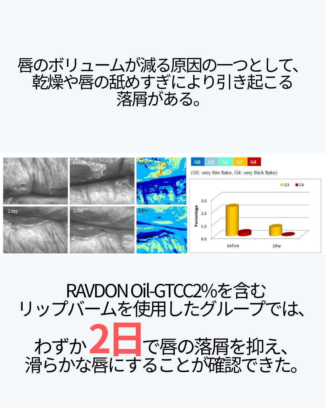 唇のボリュームが減る原因の一つとして、乾燥や唇の舐めすぎにより引き起こる落屑があります。Radvon Oil-GTCCを用いて唇の落屑を抑え、滑らかな唇になるかどうかを確認しました。